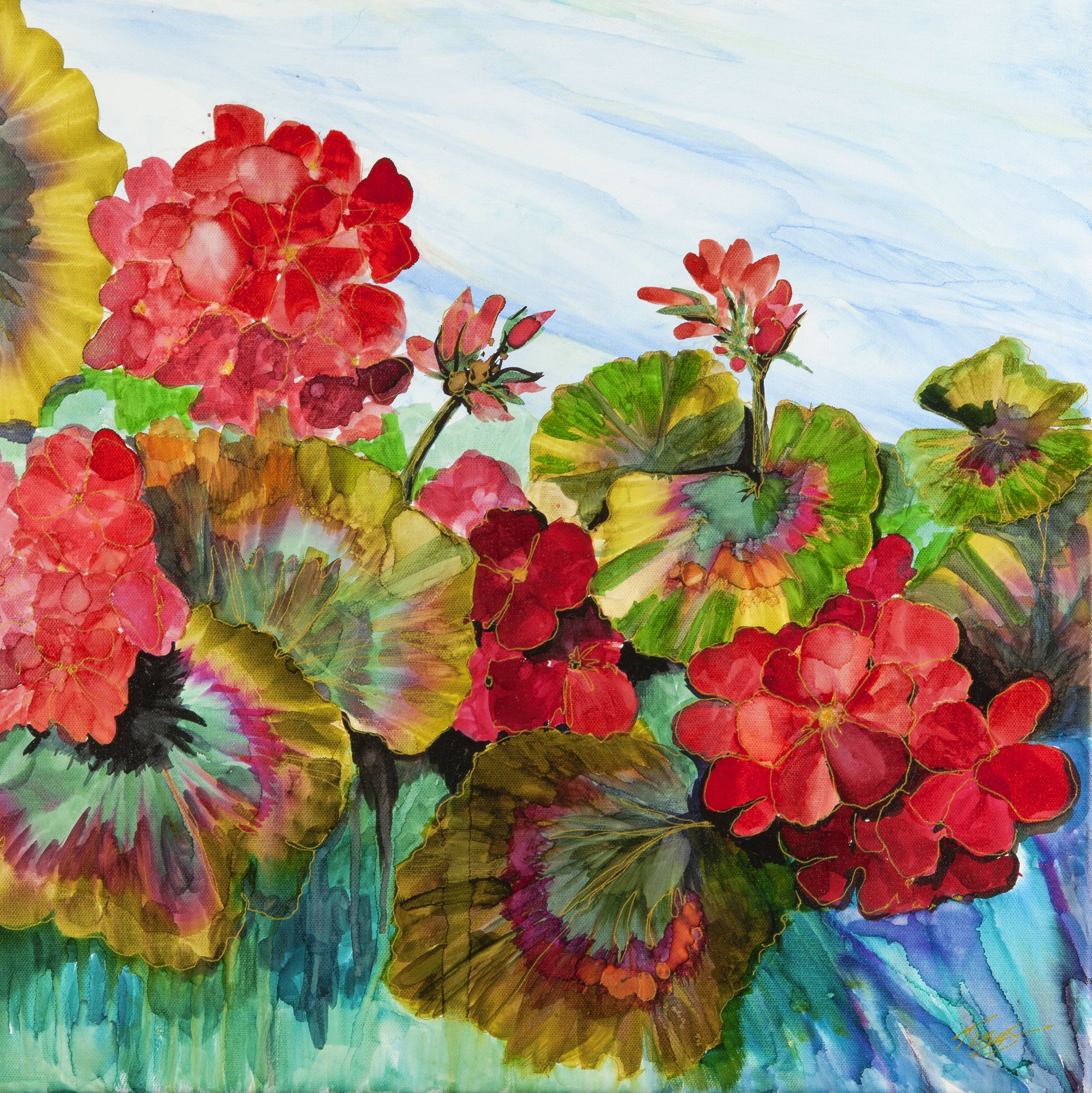 This is the second in the Geraniums set and my favorite.. Our cedar cabin had a huge deck that saw many events and many family milestones. We created 40 years of memories, which always included my mom's beautiful geraniums in the background. Alcohol ink on canvas.